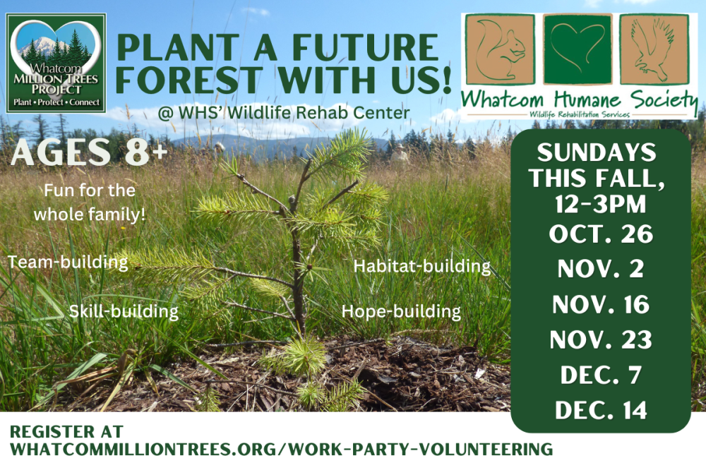 Join us as we continue converting a 12-acre former hayfield into a complex forest of native trees and undergrowth! Planting trees is easy to learn, no prior experience required. It's a great workout, and immensely satisfying as you'll be directly contributing to the development of a beautiful new forest in Whatcom County, which will become habitat for many wild creatures, including some currently being rehabilitated by WHS!