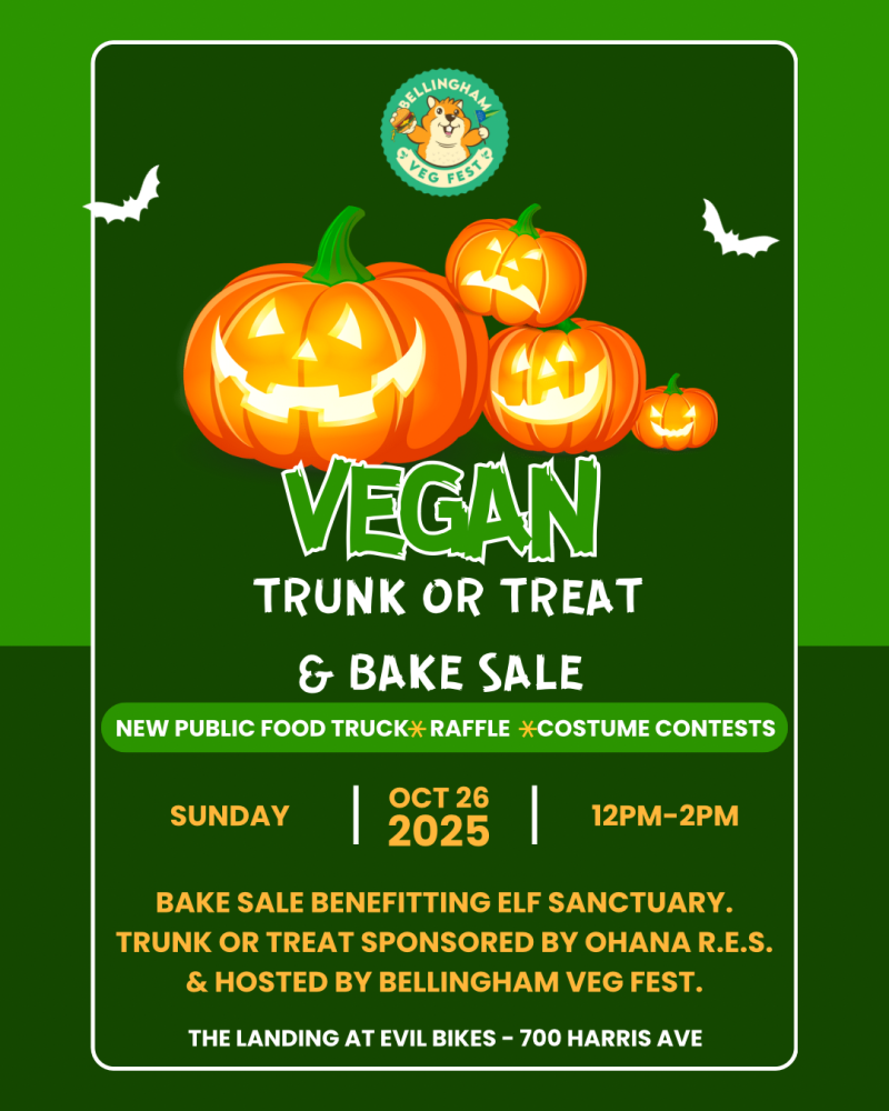 Trunk or Treat — Decorate your car, dress up, and help us hand out vegan candy to kids. Sponsored by the amazing Ian Steger of Ohana R.E.S. (All ages can collect candy!)