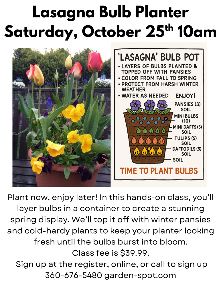 Class fee is $39.99. Sign up at the register, online, or call to sign up 360-676-5480 garden-spot.com