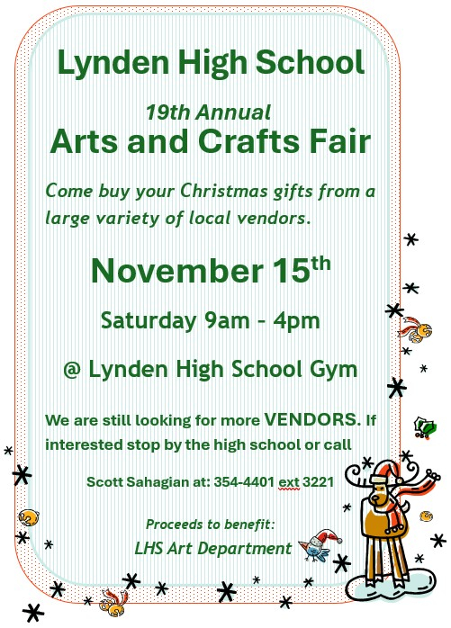 Lynden High School is having its 19th Annual Arts and Crafts Fair. Come buy your Christmas gifts from a variety of local vendors. We also have room for a few more vendors.