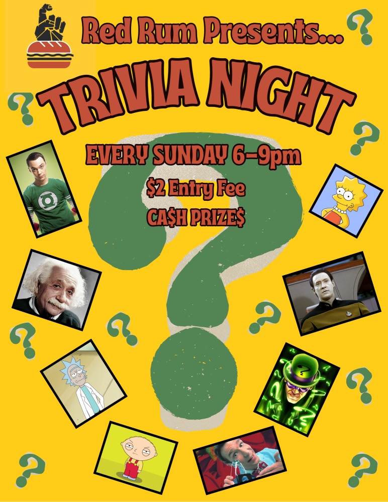Join us every Sunday 6-9pm for a fun filled evening of trivia! Bring $2 cash for your buy in, 1st place cash prize, 2nd place gets to choose a prize from the treasure chest!