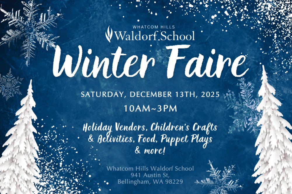 Come one, come all to Whatcom Hills Waldorf School's Winter Faire! Magic for the whole family! Visit the Snow Queen, dig for treasure in Gnome Village, enjoy puppet plays and all-ages craft workshops, shop our holiday vendor market, and warm up with food, hot beverages, and delicious baked goods in the Wooden Spoon Cafe! WHWS graduates and families are invited to stop by our alumni table for a special gift.