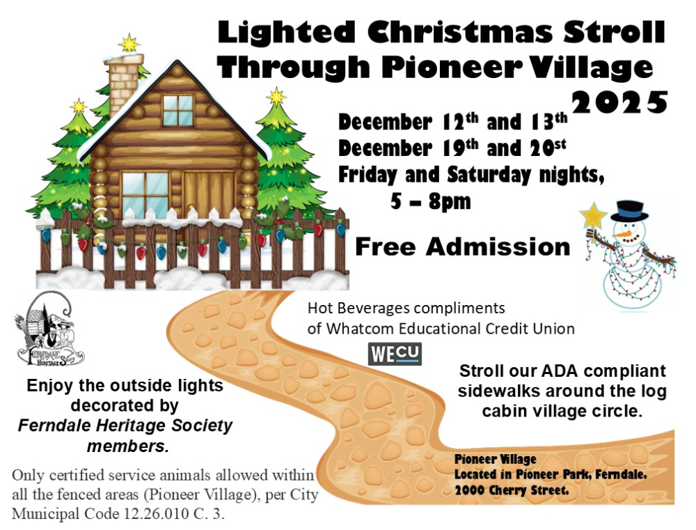 Volunteers of the Ferndale Heritage Society will again host a “Lighted Christmas Stroll Through Pioneer Village” event. This free event is a “giving back to our community” labor of love.