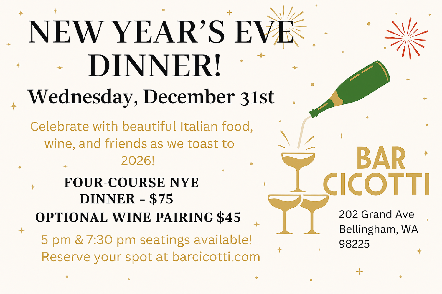 Ring in the New Year at Bar Cicotti with beautiful Italian food, wine, and friends! $75 per person for a four-course pre fixe dinner with optional wine pairing (+$45). Two seating options are available at 5pm and 7:30pm.