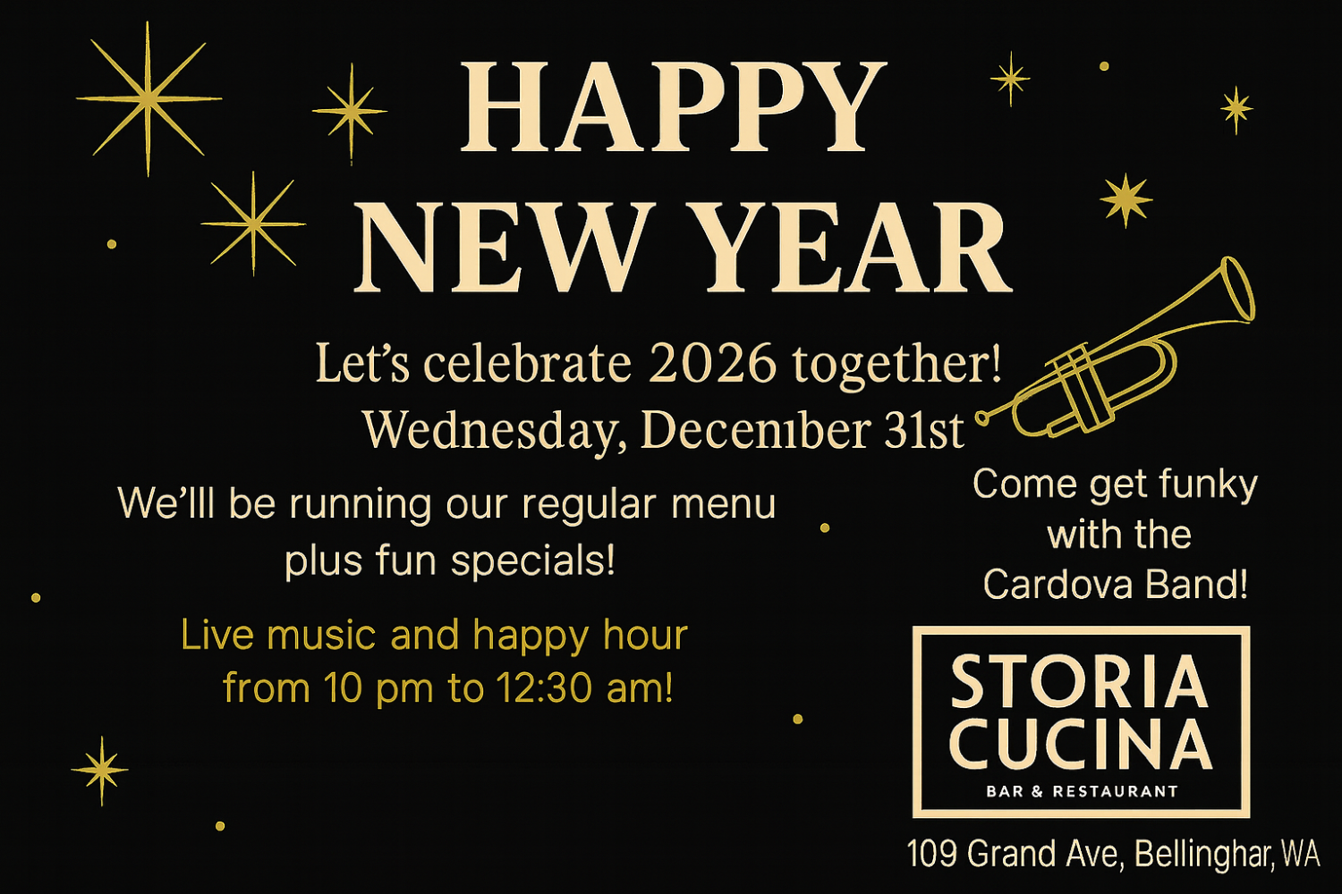 Celebrate the New Year with us at Storia Cucina! Ring in 2026 the Italian way with fun specials all day, late-night happy hour from 10pm to 12:30am, and live music in the evening from the Cardova Band.