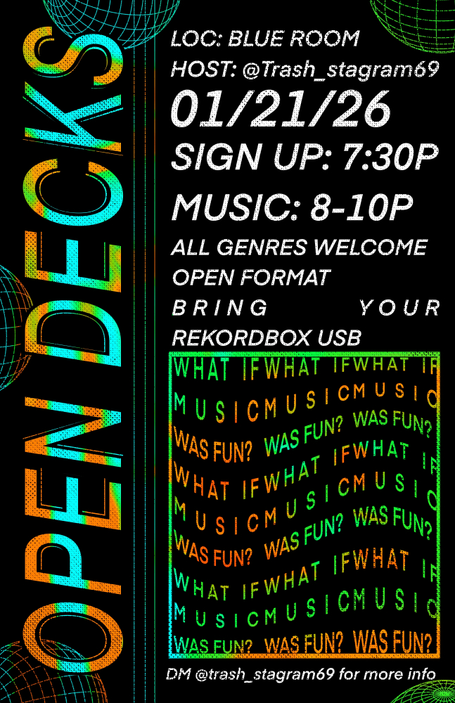 Slots are first come first serve. Simply bring your properly formatted Rekordbox USB and sign up for your 20min slot. Any genre, format, and style is welcome! This is your chance to get talent (and your crew) out of the house party and into the club!