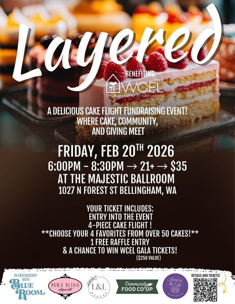 Join us for Layered at The Majestic Ballroom, a fun and engaging event that brings together the joy of tasting cake and the opportunity to connect with Whatcom Center for Early Learning (WCEL).