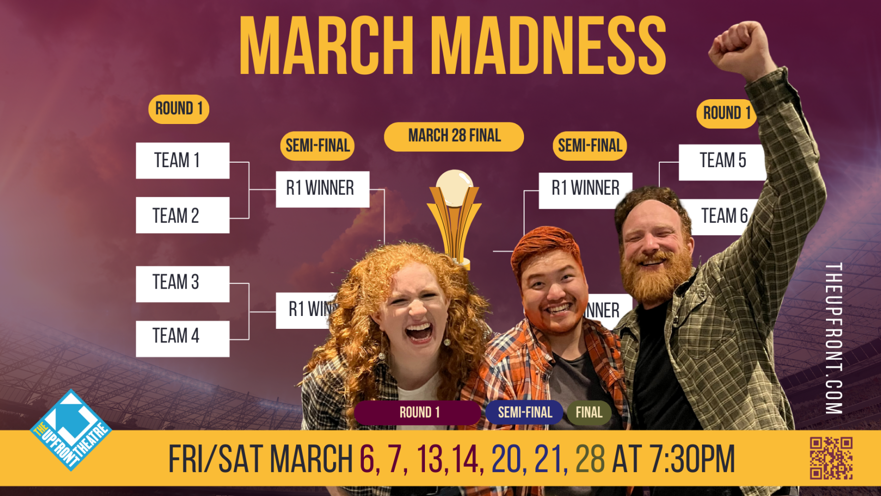It’s time for March Madness at the Upfront Theatre! We have compiled Bellingham’s funniest, most competitive, and die hard improvisors to compete in a nail biting, bracket-style improv competition all month long. Each Friday and Saturday night, different teams will perform in any comedic style, trying their best to win you over! The improvisors fate is in your hands, because it's you who will decide who will be eliminated, and who will move on to the next round.