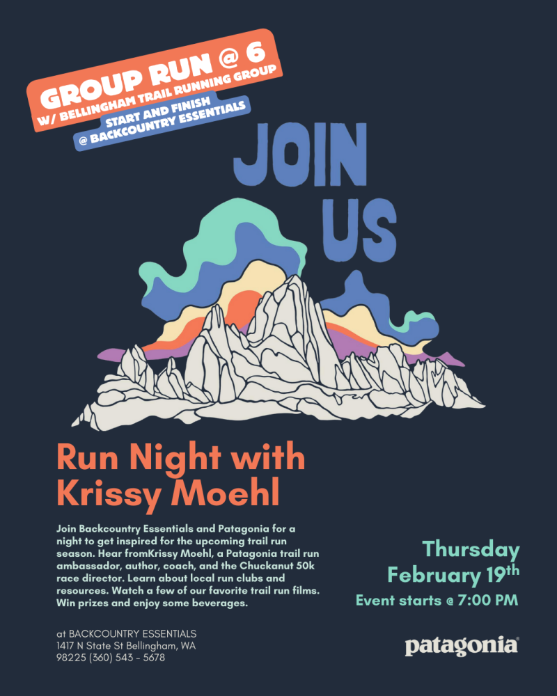 Join Backcountry Essentials and Patagonia for a night of trail run inspiration. We’ll hear from Krissy Moehl—Patagonia trail run ambassador, author, coach, and Chuckanut 50k race director—learn about local run clubs and resources, watch a few favorite trail run films, win prizes, and enjoy some beverages.