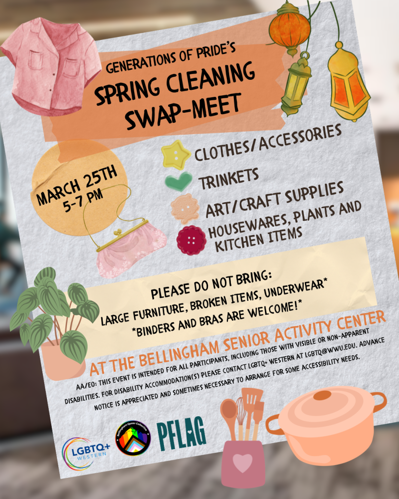 We welcome all Queer community members and allies over the age of 18 for this month's opportunity for intergenerational connection. We are hosting a Spring-Cleaning Swap Meet! Feel welcome to bring Clothes/Accessories, Trinkets, Art/Supplies, Plants, and Housewares. Binders, bras, trans tape, and other gender affirming items are greatly appreciated. We ask that you do not bring large furniture, broken items, or underwear. Generations of Pride is an ongoing collaboration with the Bellingham Queer Collective, WWU and PFLAG Whatcom.