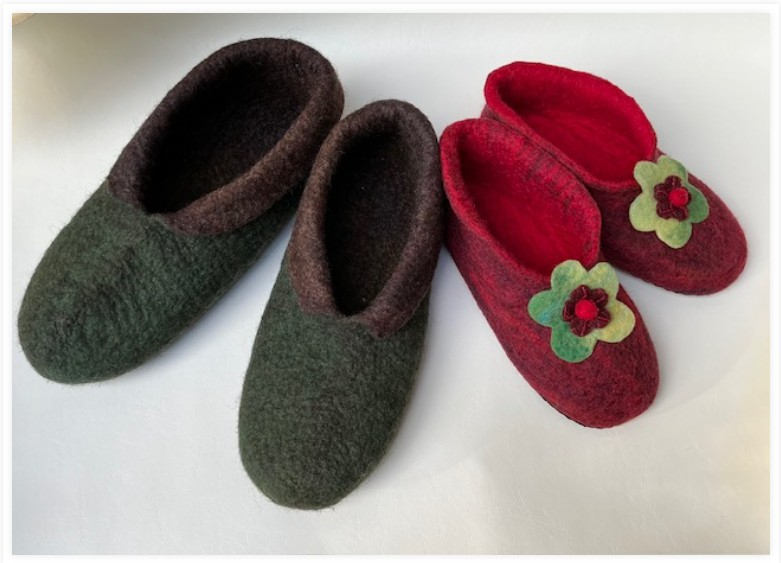 Make a hand felted pair of ballerina style slippers by layering and felting wool fibers around a custom made pattern. Decorate with fibers or fabrics. The result is a warm, strong pair of slippers of your design that fit.