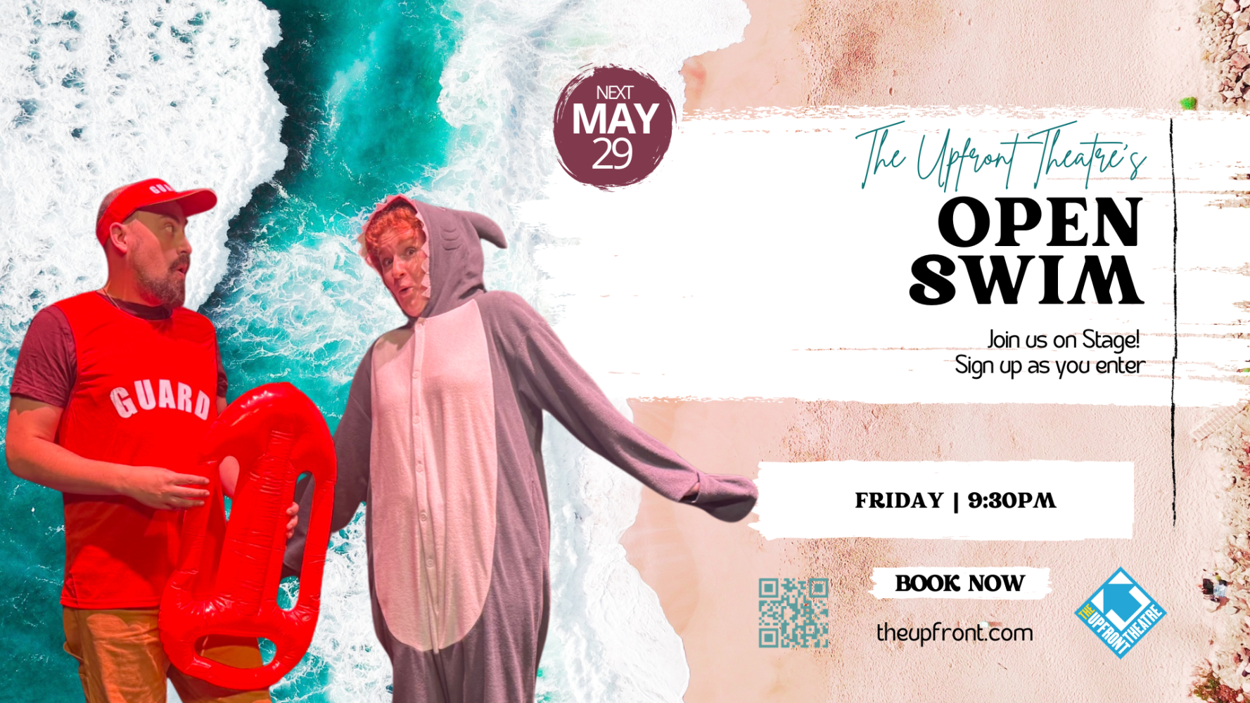 It is Open Swim at the Upfront Theatre! Sign up as you enter the theater to play improv games alongside Upfront cast members! Open to anyone regardless if you are a seasoned improviser, a student, or if this is your first time getting on stage! Our lifeguards are there to keep the scene afloat!