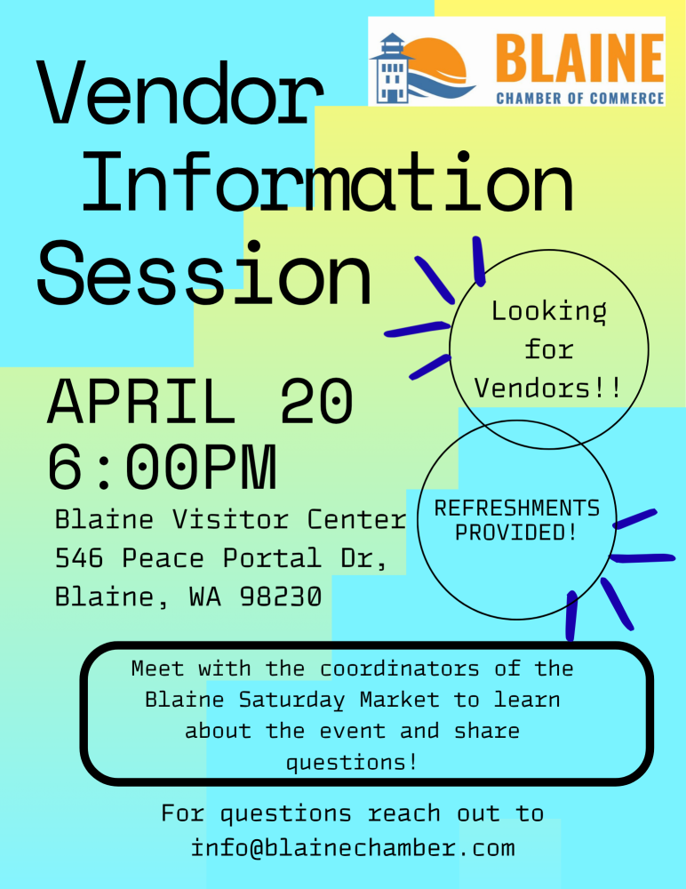 Meet with the coordinators of the Blaine Saturday Market to learn about the event and share questions! Blaine is known for its coastal vibe and small-town charm. We want to continue supporting local business by hosting a market each Saturday starting in May and running through Labor Day Weekend in September.