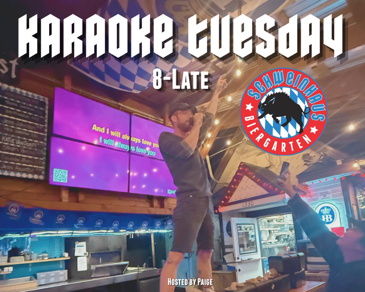 Grab the mic and take the stage. Join us every week for Karaoke Night hosted by Paige from 8:30 PM to 11 PM. Whether you’re here to perform or just cheer on your friends, it’s a high energy night in the beer garden with big TVs, big tables, and even bigger vibes.
