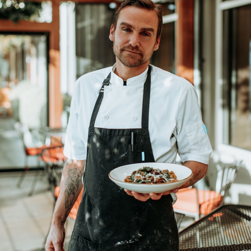 When not in the kitchen, he loves spending time in nature, playing the bass, and enjoying life at home with his wife, our dog, and two cats.